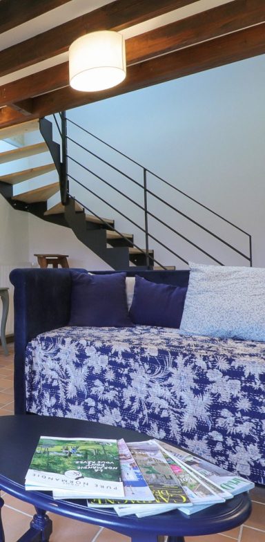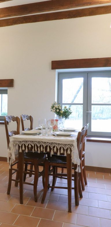 Les grandes fenêtres laissent entrer une lumière naturelle, et offrent une vue apaisante sur le jardin et les peupliers de la propriété.