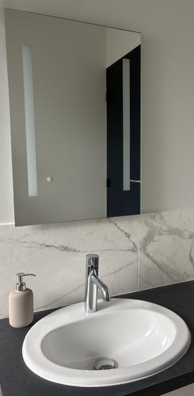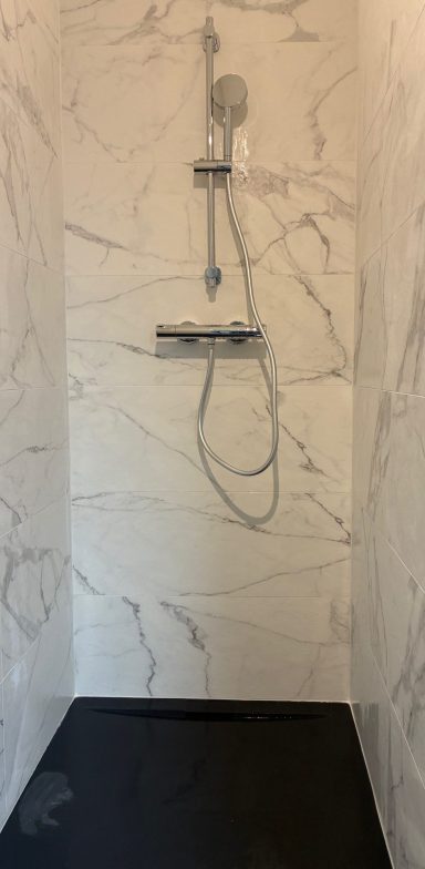 Le gîte comprend une salle d'eau spacieuse qui est dotée d'une grande douche à l'italienne au design en marbre blanc, d'un plan de toilette avec une vasque et d'un radiateur sèche-serviettes.