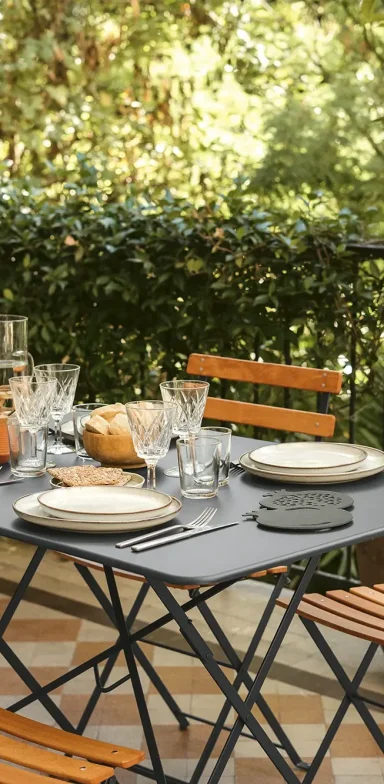 Une table et des chaises de jardin Fermob sont à votre disposition pour vos repas en extérieur et, pour vous détendre, des chiliennes en toile basque.