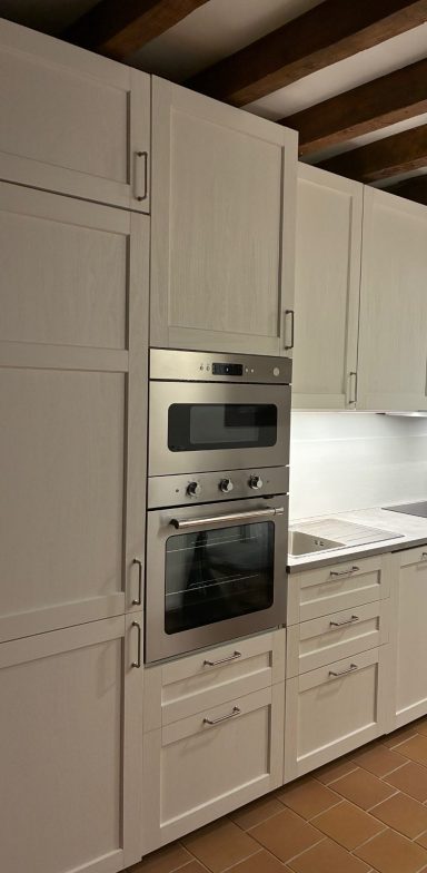 Elle comprend des plaques à induction, un four, un micro-ondes, un réfrigérateur-congélateur et un lave-vaisselle.